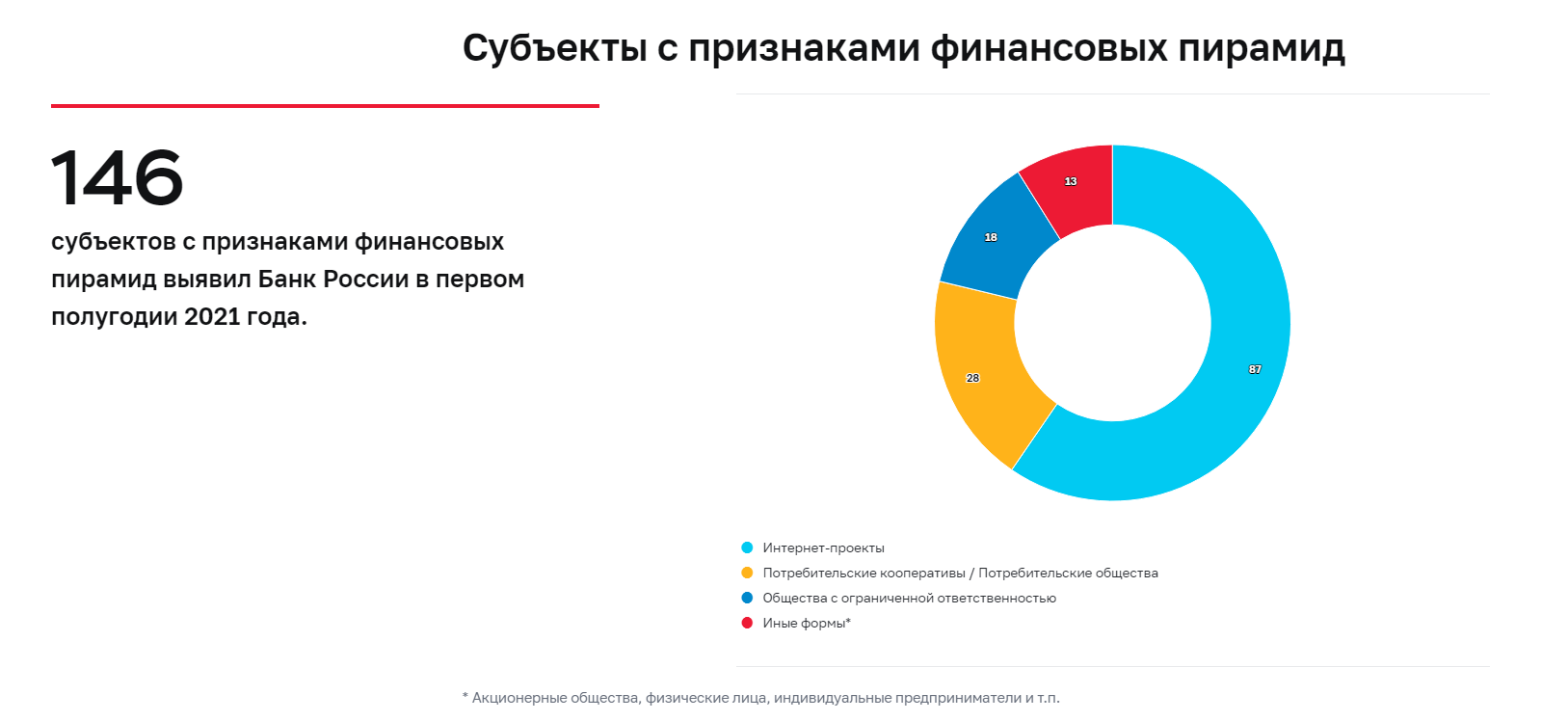 Банк России выявил 146 финансовых пирамид в России с января по июнь 2021 года. Об этом регулятор сообщил у себя на официальном сайте. При этом в ЦБ отмечают, что показатели текущего года опережают прошлый в полтора раза.