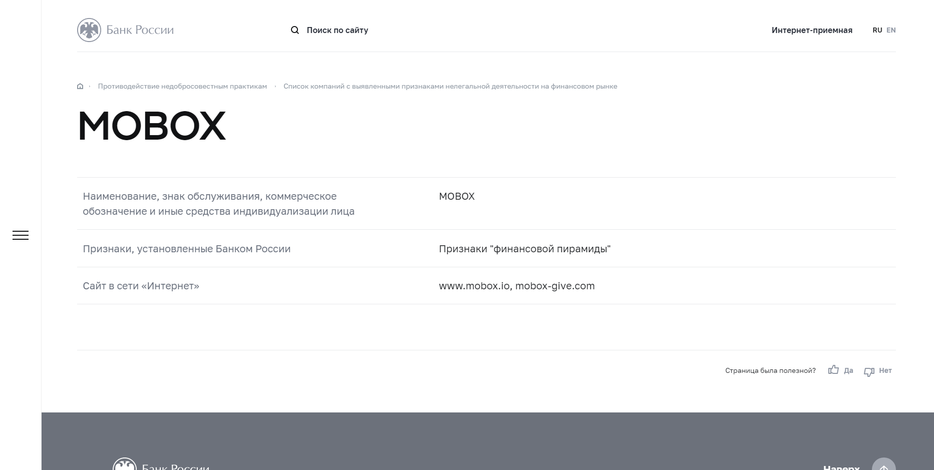 Банк России включил блокчейн-игру MOBOX в список компаний с выявленными признаками нелегальной деятельности на финансовом рынке. Согласно записи на сайте, мегарегулятор выявил признаки «финансовой пирамиды». О каких именно признаках идет речь, непонятно. Под ограничения попали домены www.mobox.io и www.mobox-give.com.