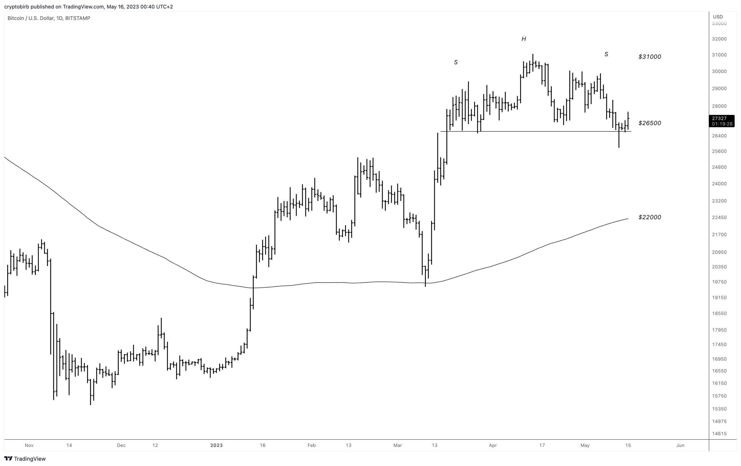 - В случае, если прогноз биткоина, который предполагает падение на фоне завершения фигуры «голова, плечи», не будет реализован, не исключено ралли BTC. На этот раз целью для монеты может стать уровень $35 000.