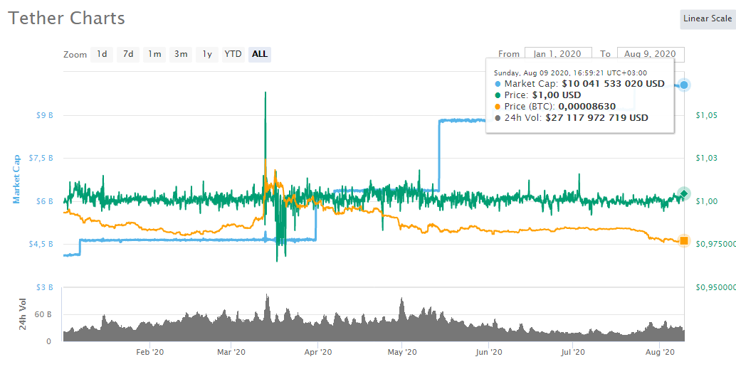 Если 30 марта рыночная капитализация USDT составляла $4,6 млрд, то уже 9 августа капитализация выросла до $10 млрд.