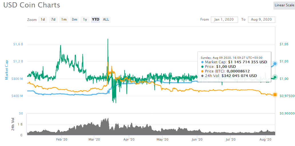 С конца марта, капитализация USDC выросла на $454,8 млн до $1,1 млрд.