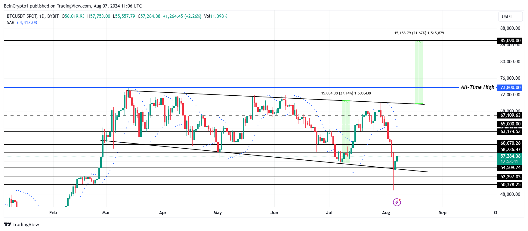 Цена биткоина — еще один индикатор, сигнализирующий о том, что BTC достиг дна. С начала марта стоимость криптовалюты закрывалась выше нижней линии тренда расширяющегося нисходящего клина на уровне $54 000. При прорыве выше $70 000 цена может вырасти на 21%.
