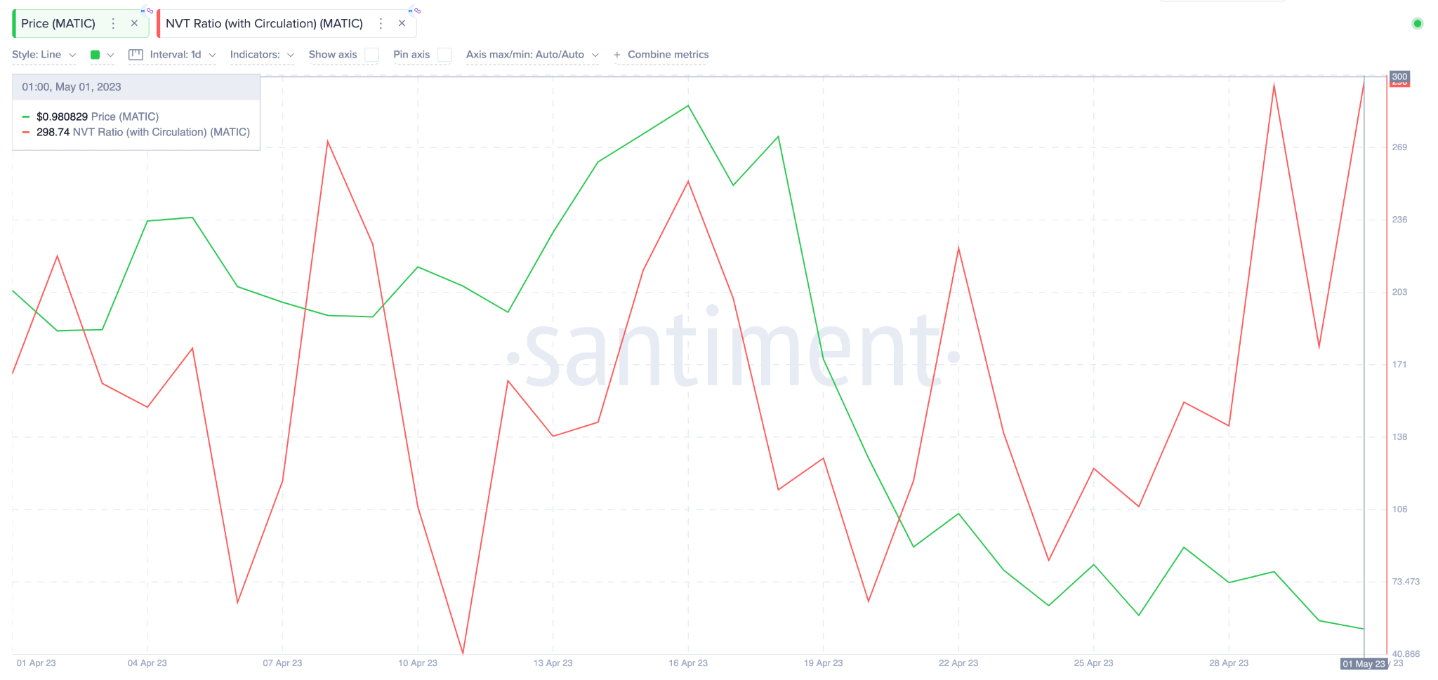 Растущее значение коэффициента NVT (Network Valuation to Transaction Volumes) — показателя, который сравнивает рыночную капитализацию криптовалюты с объемом транзакций в сети, подтверждает растущие медвежьи опасения. По данным Santiment, в период с 11 апреля по 1 мая NVT MATIC взлетел почти на 630% — с 41,28 до 298,74. Это означает, что цена актива слишком высока для текущего количества транзакций на блокчейне Polygon.
