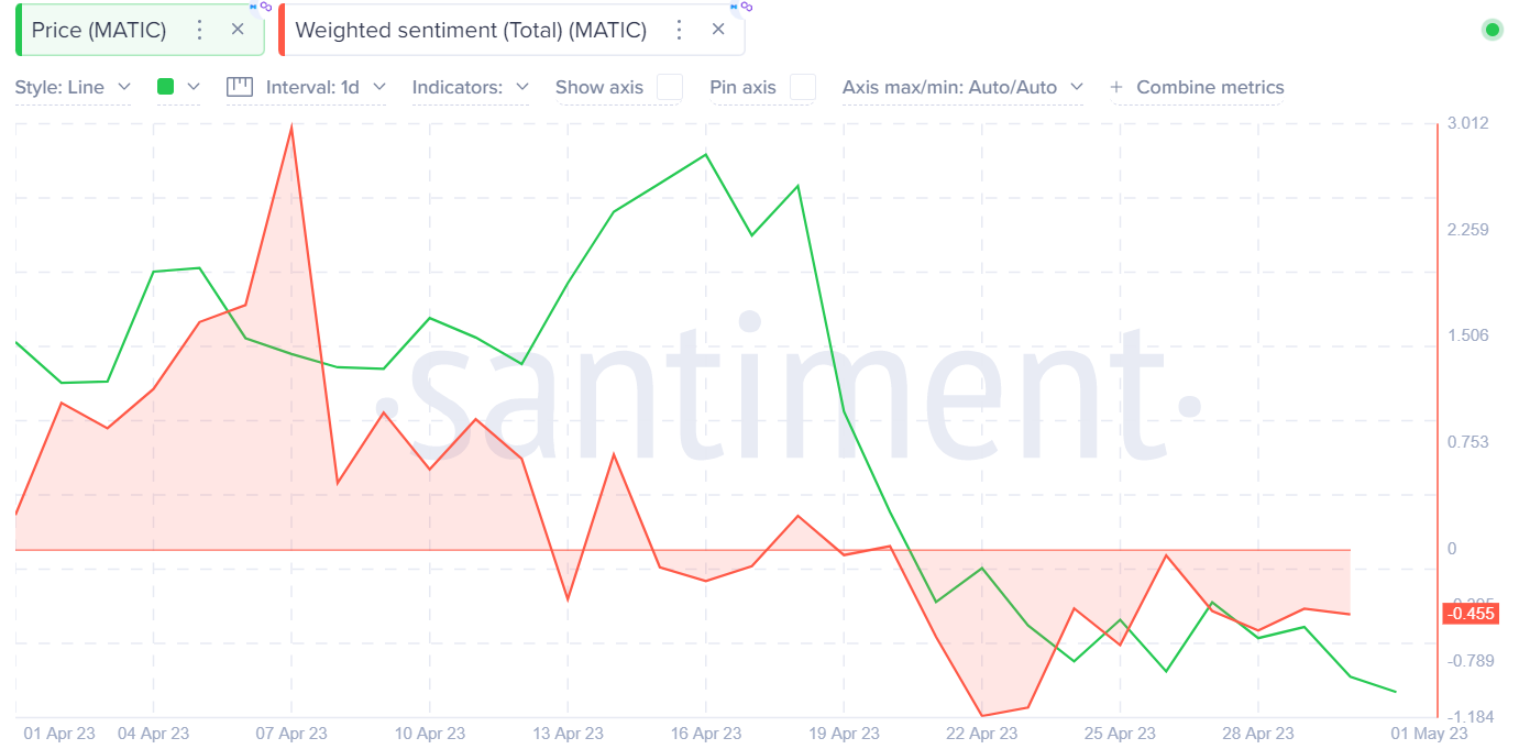 Согласно показателям ключевых ончейн-метрик, инвесторы Polygon, похоже, теряют уверенность в активе. На графике ниже показано, что социальные настроения вокруг проекта сменились на отрицательные сразу после завершения обновления Shapella. В период с 12 апреля по 1 мая показатель упал на 148% — с 0,92 до -0,45.