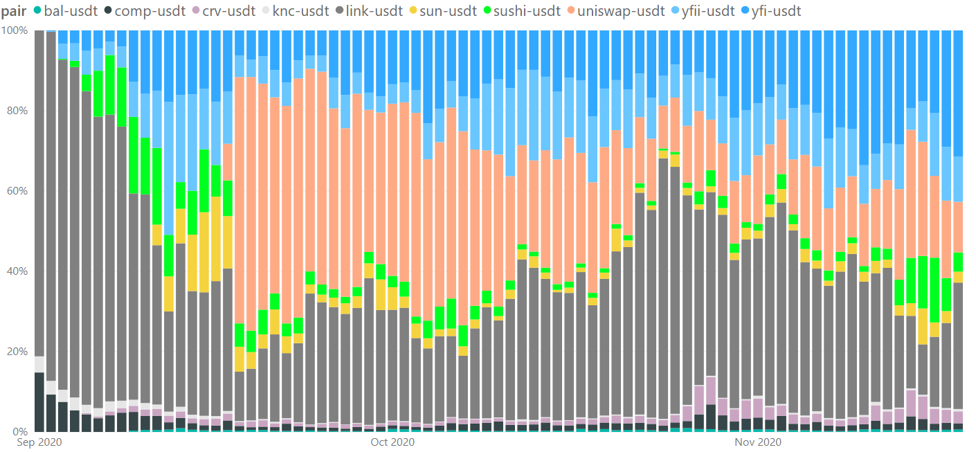Пиковый объем торгов токенами DeFi был зафиксирован 7 ноября. Это событие совпало с победой Джо Байдена на президентских выборах в США и спровоцировало бум на централизованных платформах. Децентрализованные платформы, такие как Uniswap, остались не у дел. В тот же день цена YFI поднялась с 11 800 долларов до 17 500 долларов, а затем закрылась на отметке около 14 000 долларов. В то же время BTC упал почти на 5%, показалв внутридневное колебание в 9%.