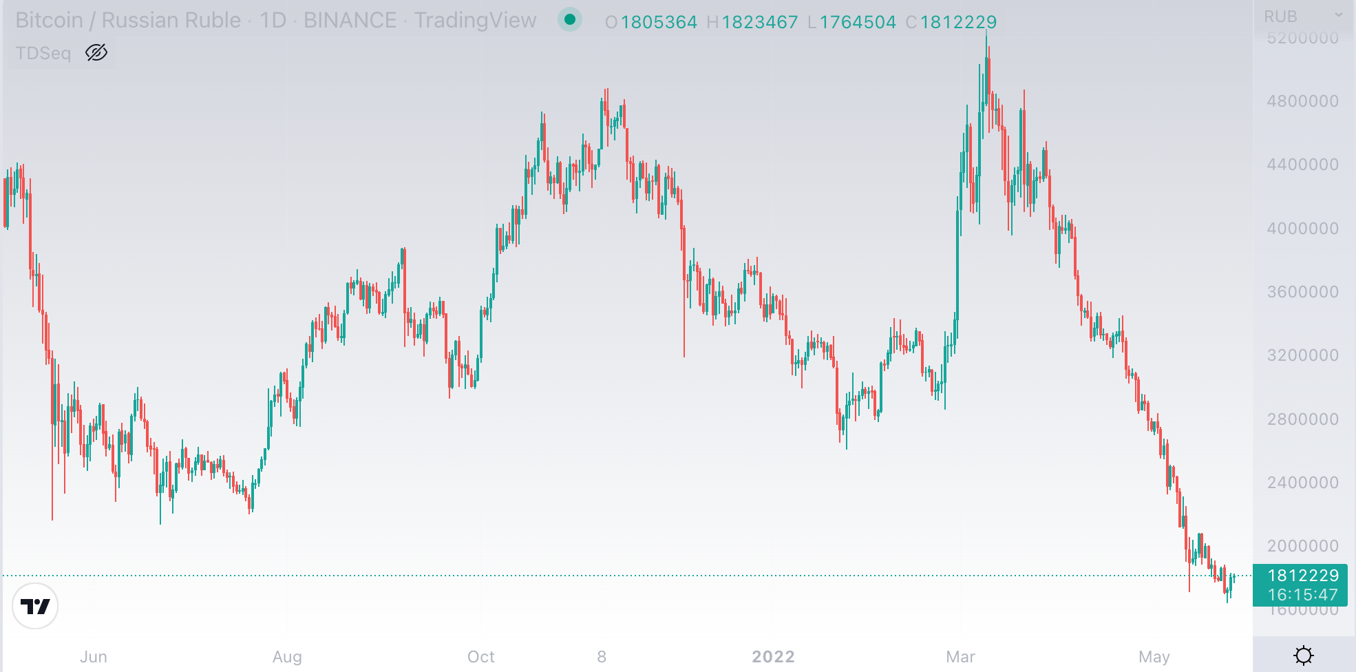 Биткоин тоже изрядно подешевел в пересчете на рубли. С начала года BTC/RUB потерял более 50% стоимости. На момент публикации за один биткоин придется заплатить 1,8 млн рублей. Это самый низкий курс с декабря 2020 года. На пике BTC/RUB стоил 5,8 млн. Стоимость биткоина в рублях напрямую связана с динамикой курса доллар/рубль.