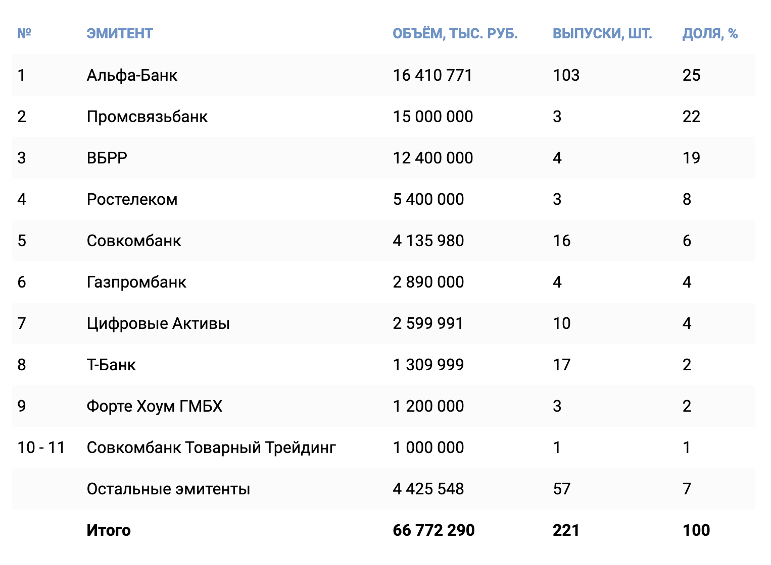 Однако основную часть выпускаемых активов занимают банки, которые составляют около 65% от общего объема размещений. Это объясняется тем, что для банков и финансовых организаций ЦФА — отличный инструмент для привлечения капитала с минимальными затратами времени.