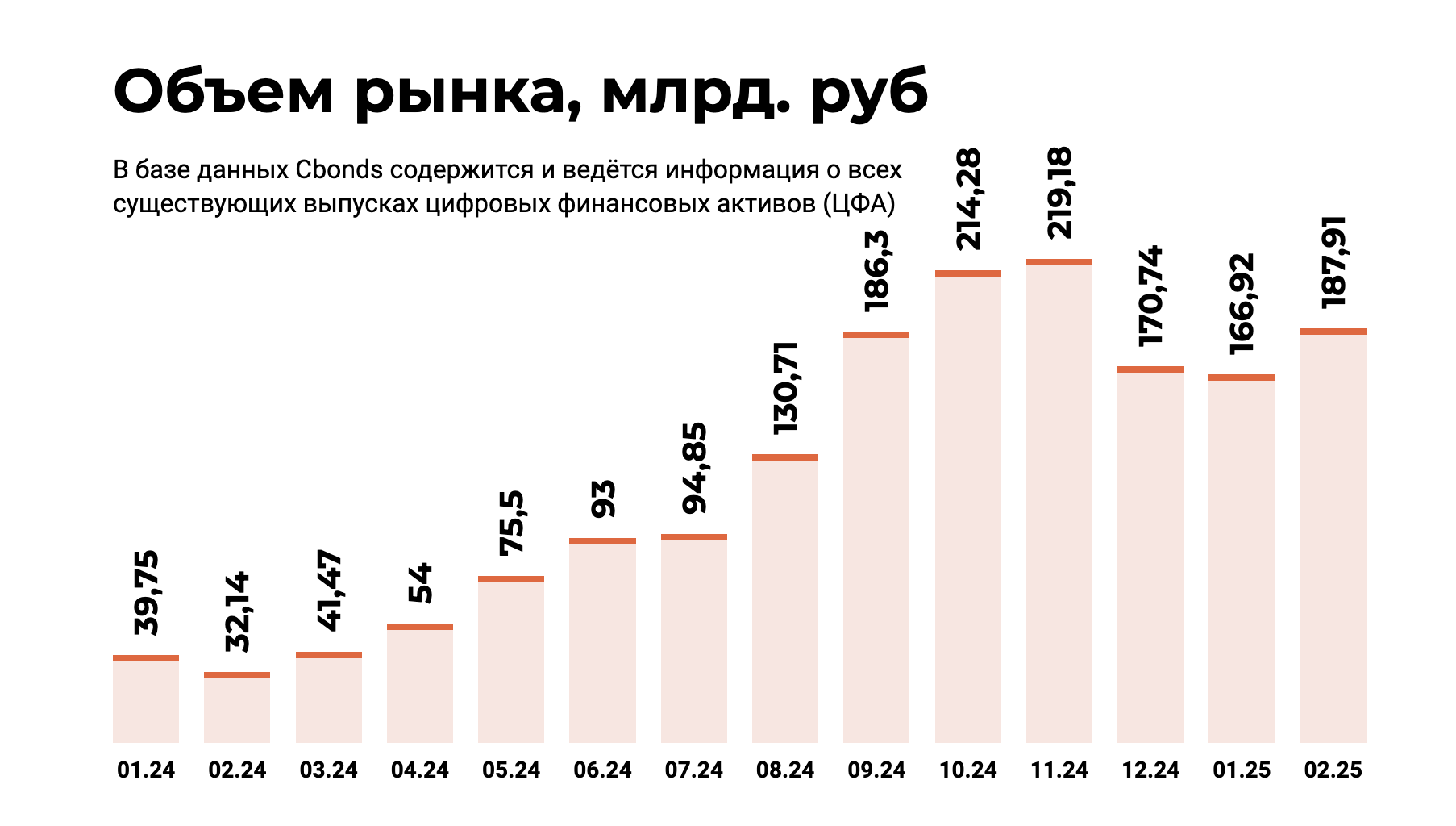 По состоянию на февраль 2025 года объем российского рынка ЦФА оценивался в 187 млрд рублей.