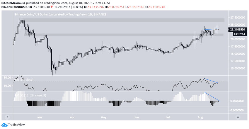 Краткосрочные графики также указывают на наличие медвежьих сигналов. Во-первых, девиация над уровнем $23.5, которая выглядит уязвимой, поскольку BNB вернулся под область сопротивления. Во-вторых, RSI и MACD сигналят о медвежьей дивергенции.