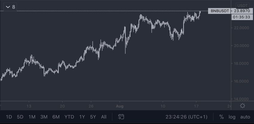 BNB плавно растет с 13 марта. Ралли забуксовало в конце июля, когда котировки достигли области $21.5 и отскочили. Однако 3 августа монета все-таки пробила этот уровень, который в итоге превратился в поддержку. В случае продолжения подъема следующий барьер ожидается в области $25.5.