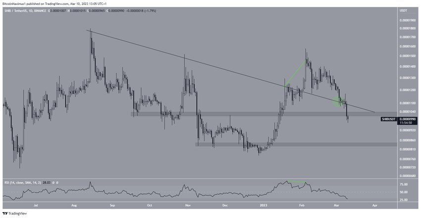 Сначала казалось, что SHIB отскочил от предыдущей линии нисходящего сопротивления (зеленый круг). Однако цене не удалось закрепить этот ход, и 9 марта она просела под эту отметку. Кроме того, 9 марта токен прорвал область поддержки $0,0000100.