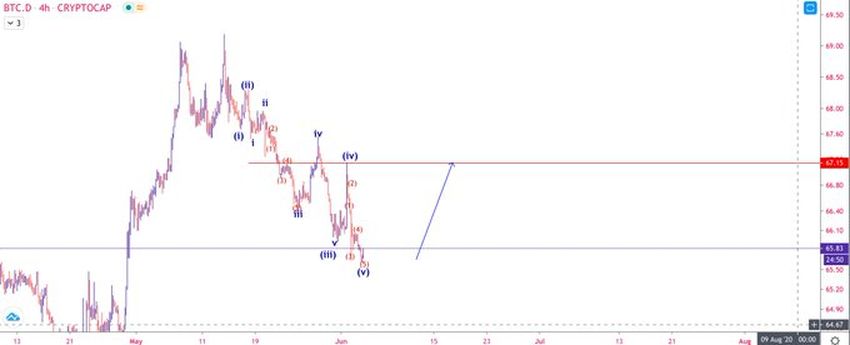 Действительно, это предположение не лишено оснований. С одной стороны, индекс BTCD стабильно снижается с 14 мая, двигаясь вдоль линии нисходящего сопротивления, причем с начала июня темпы этого снижения ускорились. Однако сейчас на графике можно увидеть определенные признаки разворота.