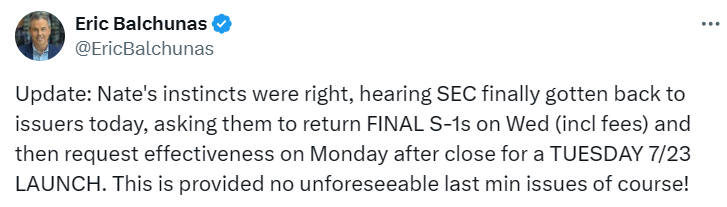 Эрик Балчунас пришел к выводу о том, что старт торгов запланирован на 23 июля на основе тайминга возврата заявок по форме *S-1, который установила Комиссия по ценным бумагам и биржам США (SEC) для эмитентов инструмента. По его мнению, изменить планы по запуску спотовых Ethereum-ETF в США могут только непредвиденные обстоятельства.