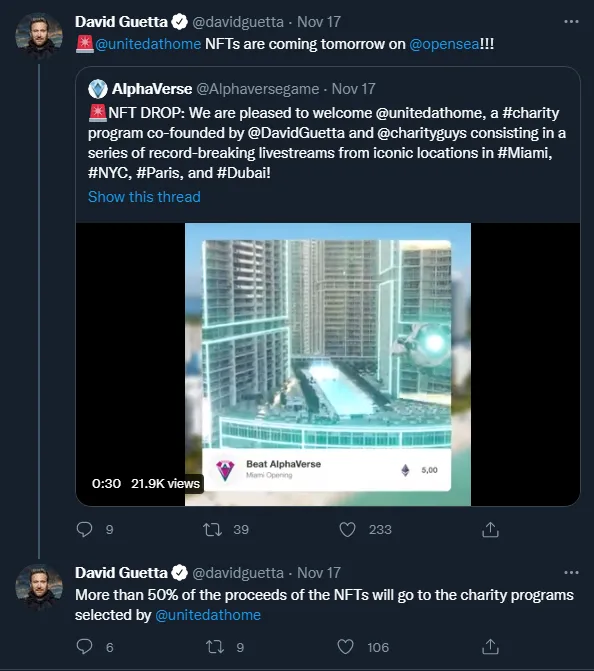 Французский диджей и продюсер Дэвид Гетта продал невзаимозаменяемые токены (NFT) на $250 000 в рамках благотворительной акции его концертов United at Home при поддержке «музыкальной метавселенной» AlphaVerse. Об этом провайдер аукциона компания Crypto Blockchain Industries объявила в пресс-релизе.