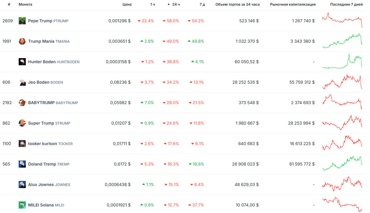 Большинство PolitiFi-монет продемонстрировали отрицательную динамику. Например, Pepe Trump (PTRUMP) подешевел на 58%, а Trump Mania — на 49%.