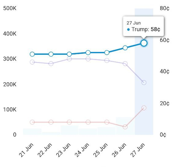 Зрителям выступления кандидатов на пост главы Америки показались хаотичными и напряженными. Тем не менее в политической гонке появился явный лидер. На это указывают результаты рынка ставок, о которых мы поговорим чуть позже.