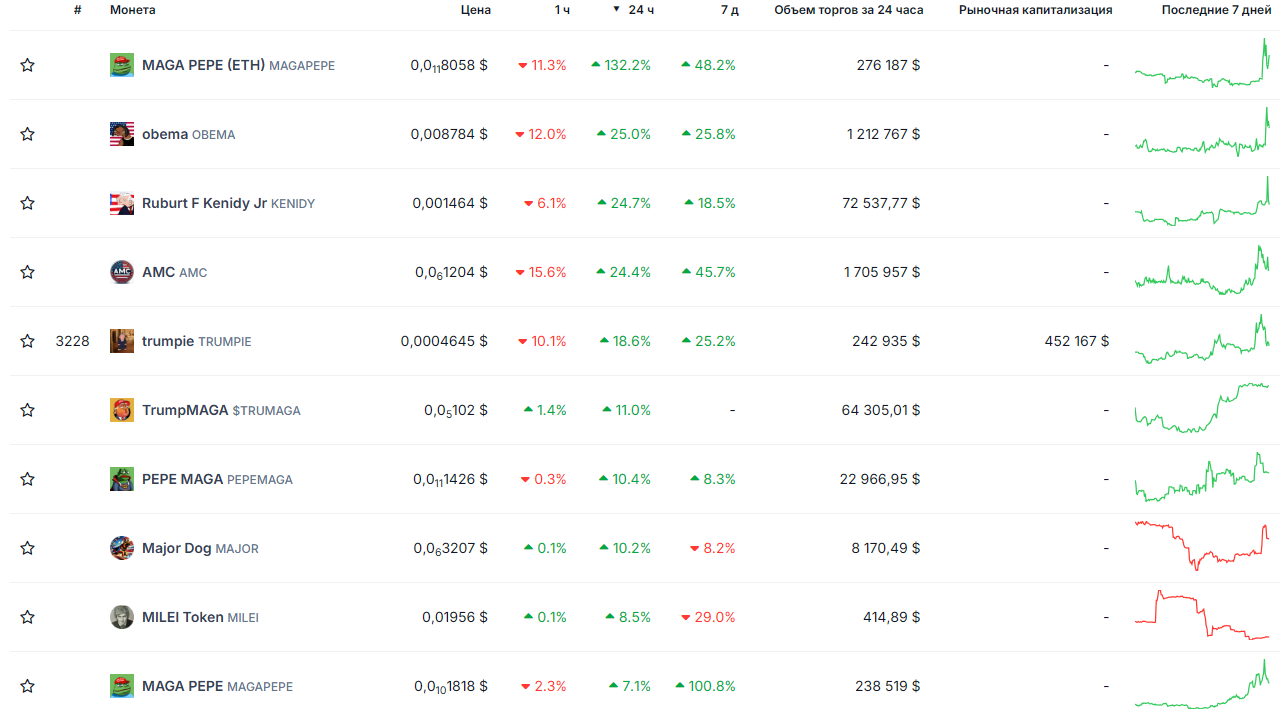 Впрочем, инвесторам некоторых PolitiFi-монет все же удалось заработать. Например, токен MAGA PAPA (ETH) за 24 часа подорожал на 132%, а obema (OBEMA) — на 25%.