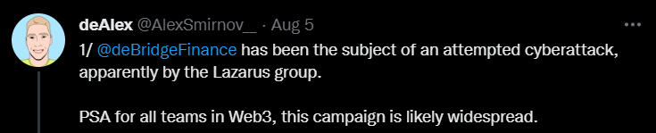 Кросс-чейн протокол deBridge пытались взломать, предположительно, северокорейские хакеры из группировки Lazarus Group. Об этом в твиттере сообщил соучредитель проекта Алекс Смирнов.