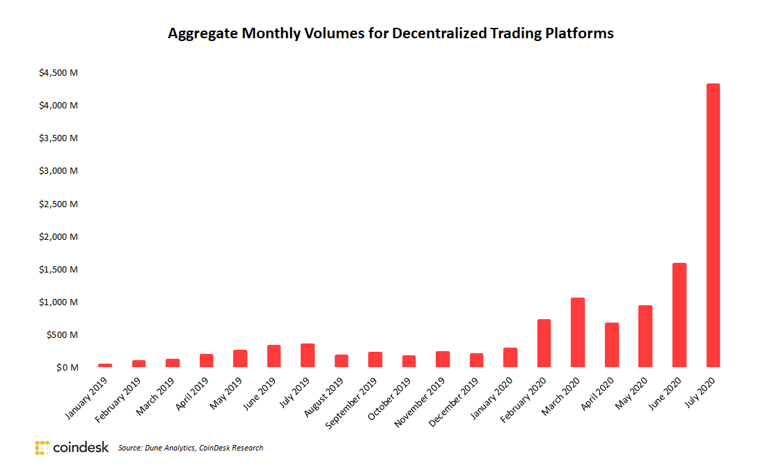 Согласно данным Dune Analytics, в июле децентрализованные биржи установили новый рекорд по объемам торгов, достигнув отметки в $4,32 млрд.