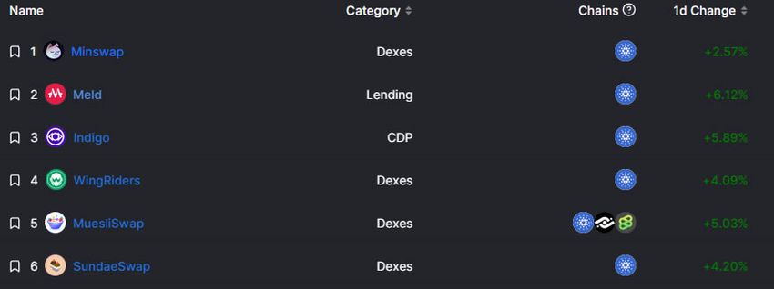 SponsoredТак, Minswap, ведущая децентрализованная биржа (DEX) в экосистеме Cardano, показала за последний день прирост показателя TVL (общая стоимость заблокированных в протоколе активов) на 2,53%. Более чем на 5% за день вырос этот показатель и на платформах Indigo, WingRiders и MuseliSwap. Впрочем, лидером в первой пятерке децентрализованных проектов стал Meld, некастодиальный DeFi-протокол кредитования.