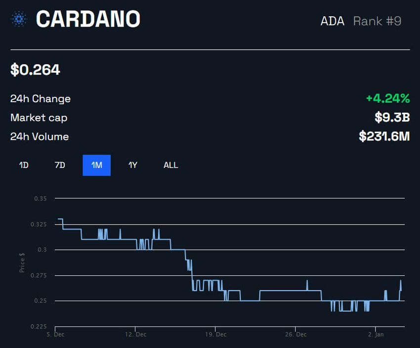 Между тем курс ADA за последние сутки укрепился более чем на 5%, а на момент написания торговался в районе $0.266.
