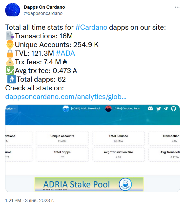Согласно другой статистике по активности в сети Cardano, децентрализованные приложения (dApps) на базе этого блокчейна отметили важную веху, достигнув «круглого» показателя в 16 млн совершенных транзакций: