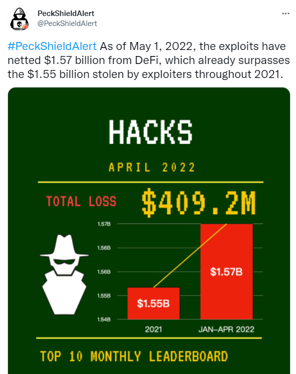 Рынок децентрализованных финансов (DeFi) с начала года лишился $1,57 млрд. Об этом у себя в Твиттере сообщили аналитики фирмы PeckShield. За первые четыре месяца 2022 года злоумышленники фактически обокрали рынок больше, чем за весь 2021 год.