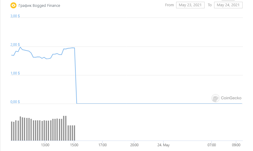 Последствия атаки сразу отразились на токене BOG, который в считанные минуты потерял 100% стоимости. Еще в воскресенье, 23 мая, токен торговался на уровне $1,9. На момент написания материала его цена составляет $0,00046608.