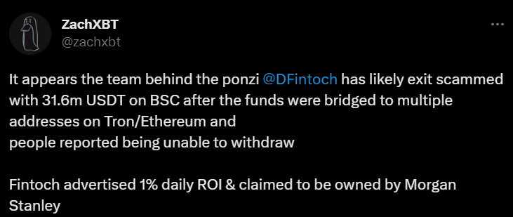 DeFi-протокол Morgan DF Fintoch, рекламирующий себя как площадка от американского банка Morgan Stanley для ежедневного заработка процентов на вкладах, мог совершить экзит-скам. Такое мнение у себя в «Твиттере» озвучил блокчейн-расследователь @ZachXBT. Подозрения в мошенничестве появились вскоре после того, как пользователи стали сообщать о проблемах с выводом капитала с площадки.