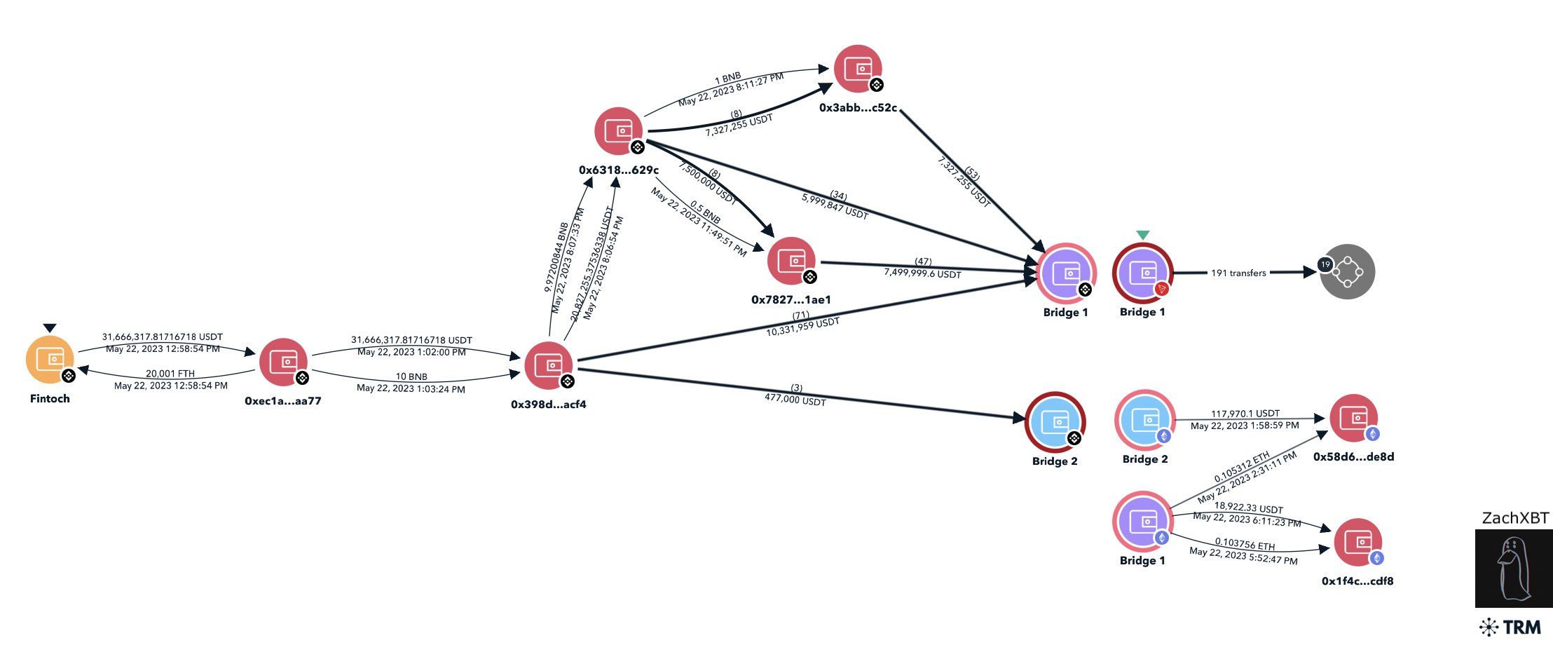 Как выяснил расследователь, криптовалютный адрес Morgan DF Fintoch через серию запутывающих транзакций вывел свыше $30 млн в стейблкоине USDT на базе BNB Chain (бывш. Binance Smart Chain) на два адреса, принадлежащих кросс-чейн мостам. На момент написания материала в Morgan DF Fintoch никак не прокомментировали подозрения в мошенничестве.