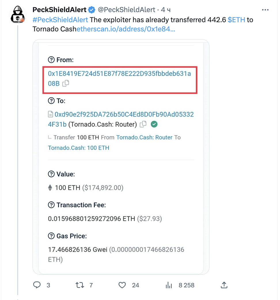 В PeckShield выявили адрес, на который мошенники перевели деньги. Более того, 442,6 ETH уже ушло с него в криптомиксер Tornado Cash. Таким образом, по текущему курсу злоумышленники вывели $768 000.