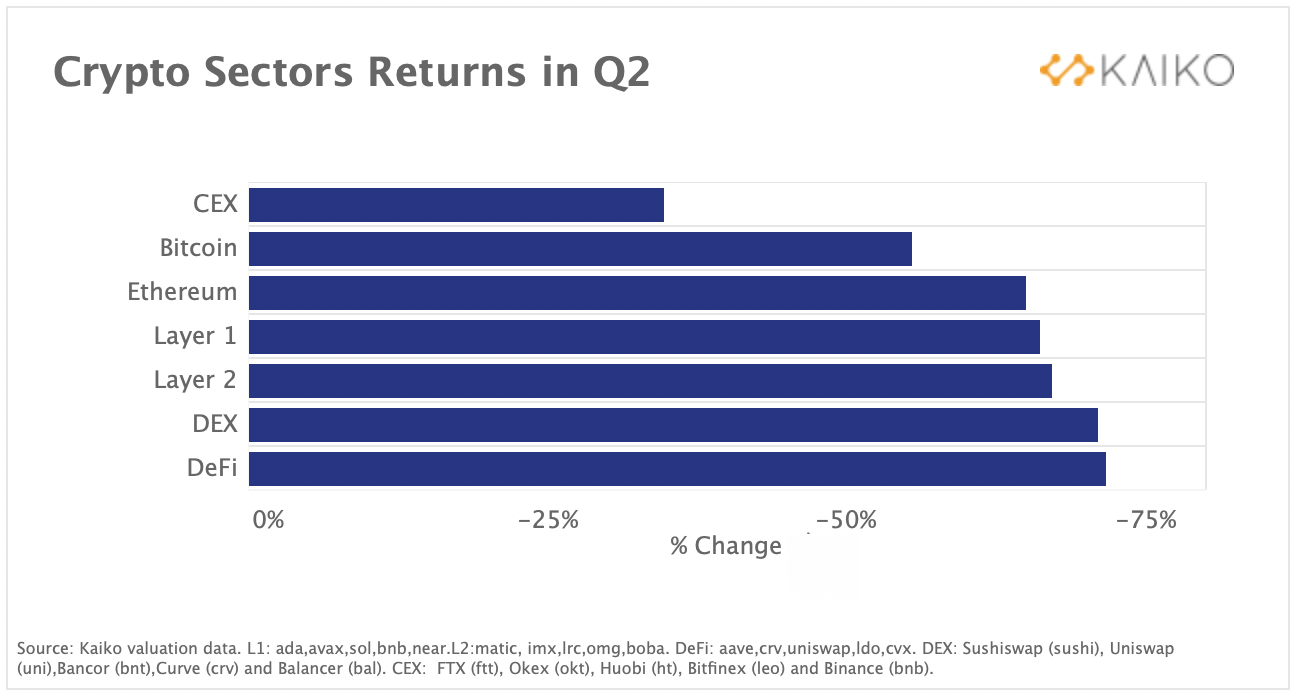 Токены децентрализованных финансов (DeFi) пострадали больше всех из-за падения рынка криптовалют. Об этом у себя в рассылке сообщили аналитики Kaiko. Они выяснили, что среди токенов AAVE, CRV, UNI, LDO и CVX средний процент падения котировок за II квартал превысил 70%.