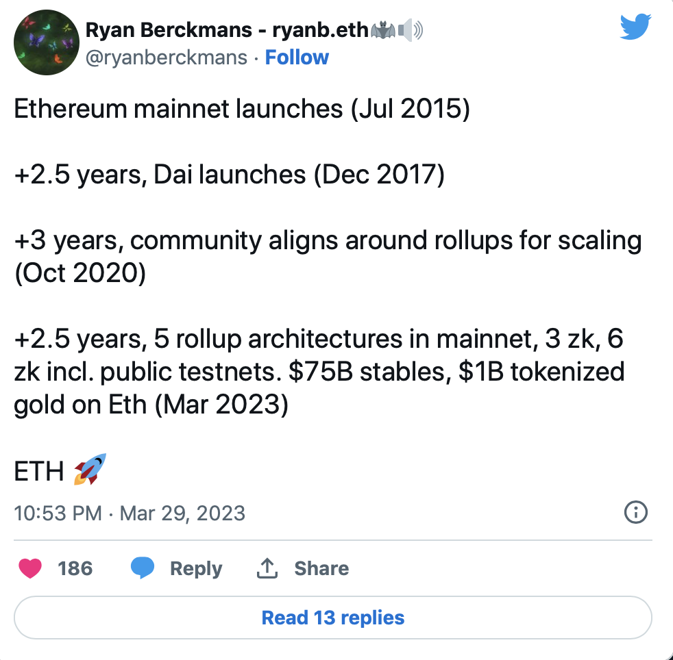 30 марта известный адвокат криптоиндустрии Райан Беркманс опубликовал в «Твиттере» список достижений экосистемы, которой едва исполнилось восемь лет: