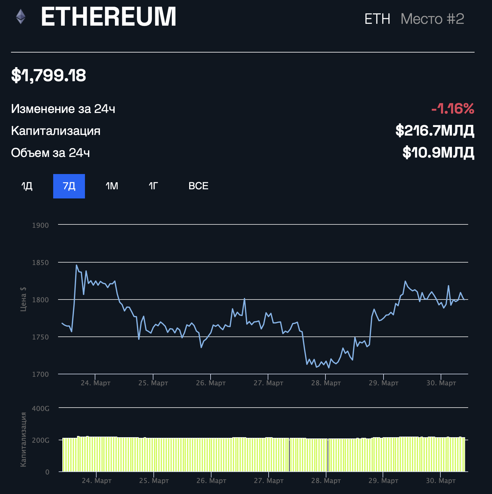За последние 24 часа цена Ethereum практически не изменились. На момент написания актив торгуется на отметке $1799.