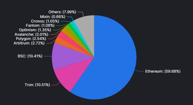 Если сравнивать блокчейны между собой, то Ethereum контролирует почти 60% заблокированной в децентрализованных (DeFi) протоколах стоимости. На Polygon приходится около 2,5%.