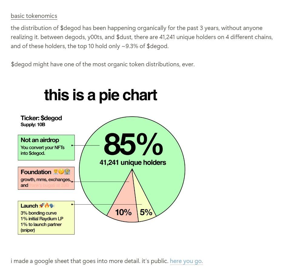 Согласно токеномике, 85% от общего предложения DEGOD предназначены для держателей NFT-коллекций De Labs. Распределение оставшихся монет выглядит следующим образом: