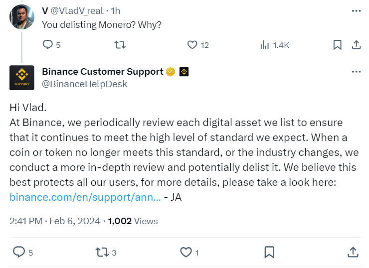 «В Binance мы периодически проводим проверки цифровых активов из листинга, чтобы убедиться в том, что они продолжают соответствовать нашим высоким стандартам. Когда монета или токен больше не соответствует стандартам или в индустрии происходят изменения, мы проводим глубокую проверку, которая может привести к решению о делистинге актива», — так команда Binance ответила пользователю на вопрос о причинах делистинга Monero.