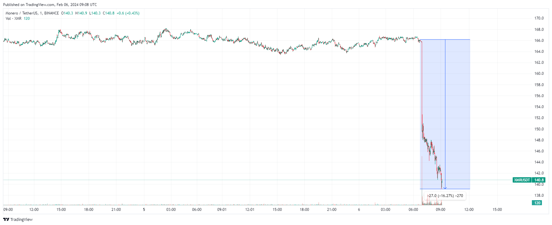 Monero отреагировала на новость о делистинге с Binance падением на более чем 16%. По состоянию на момент написания обзора, криптовалюта торгуется по $140.
