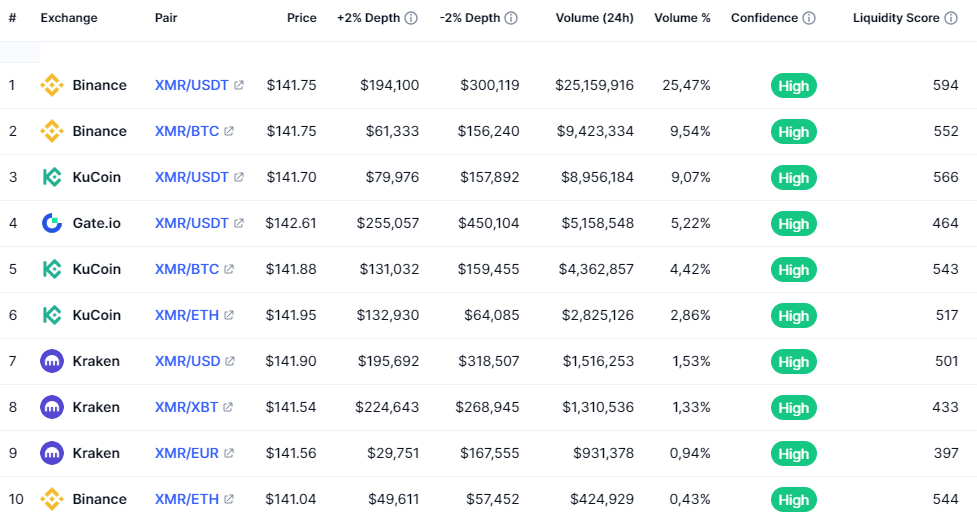 Monero торгуется на многих других популярных биржах, включая KuCoin, Gate.io и Kraken. Но крупнейший объем торгов, по данным CoinMarketCap, зафиксирован на Binance.
