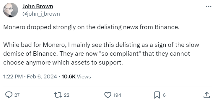 «Monero падает на новостях о делистинге криптовалюты с Binance. Это, конечно, плохо для Monero, но решение о делистинге также можно рассматривать, как признак медленного упадка самой биржи. Теперь Binance настолько “послушна”, что она просто не может самостоятельно выбирать, с какими активами работать», — так прокомментировал решение о делистинге XMR с Binance популярный в криптосообществе трейдер Джон Браун.