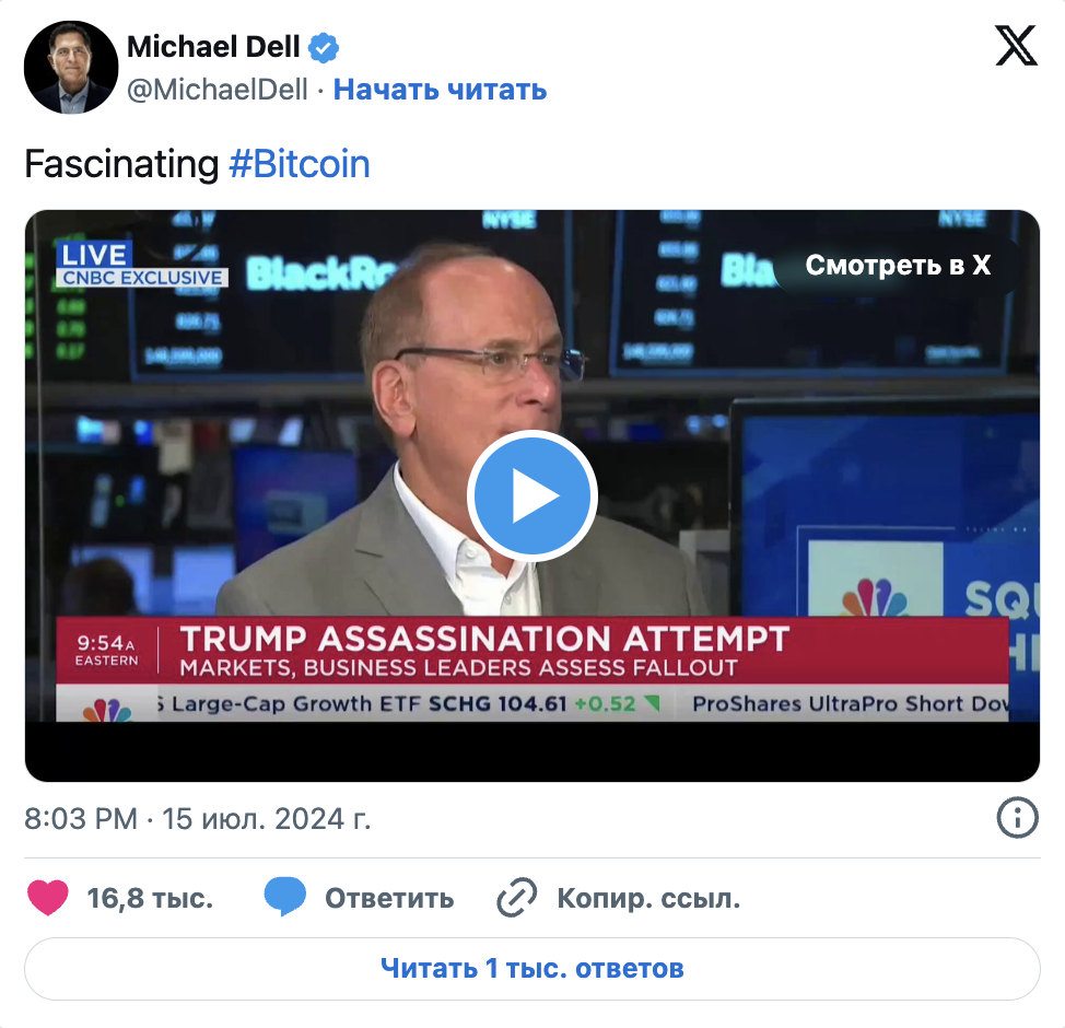 Подозрения усилились, когда в июле Майкл Делл опубликовал видео, где генеральный директор BlackRock Ларри Финк обсуждает биткоин.