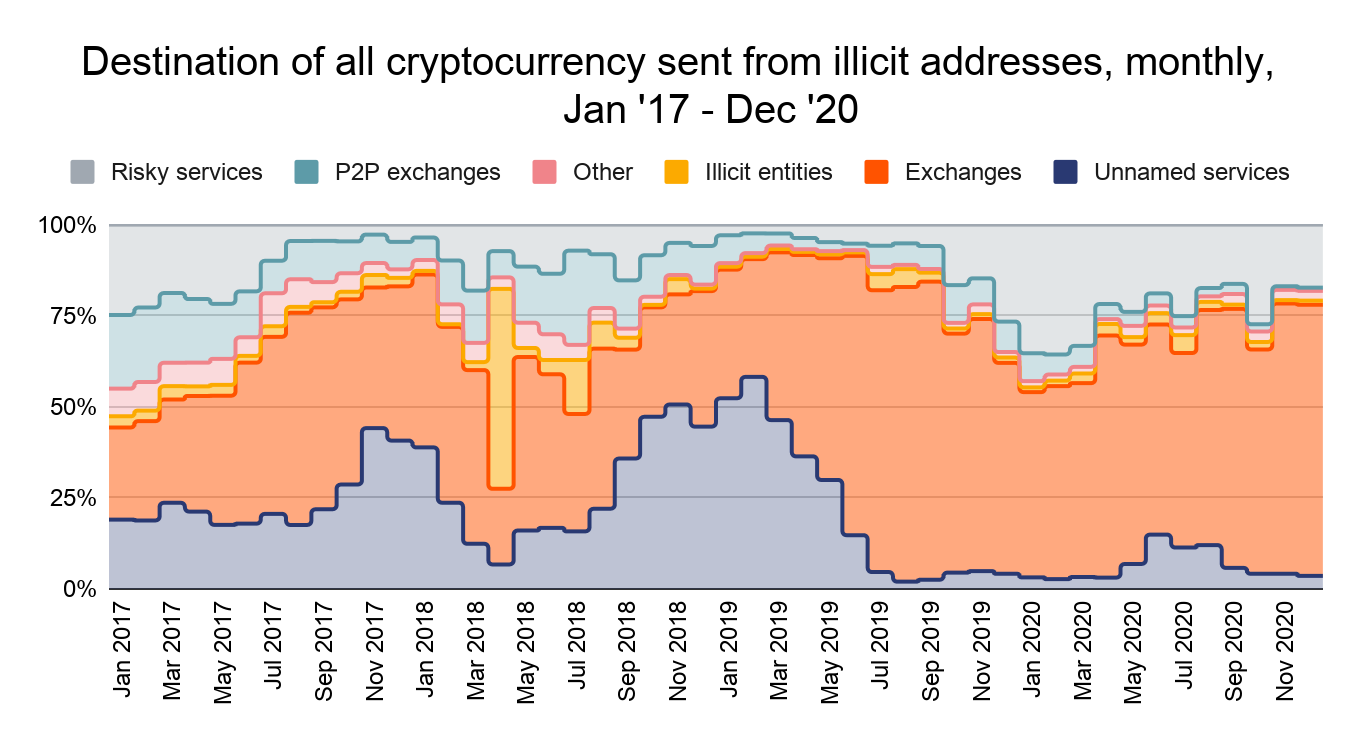 Исторически сложилось так, что основной массив незаконно полученных денег проходил через крупные централизованные и децентрализованные биржи. С принятием Пятой директивы ЕС, которая фактически обязала торговые площадки внедрить процедуру KYC для своих клиентов, объемы отмываемых средств на централизованных площадках немного снизились. Однако в 2020 году вновь наметился рост. Вероятнее всего теперь деньги отмываются через децентрализованные биржи, которые сохраняют полную анонимность клиентов. Об этом говорится в исследовании Chainalysis