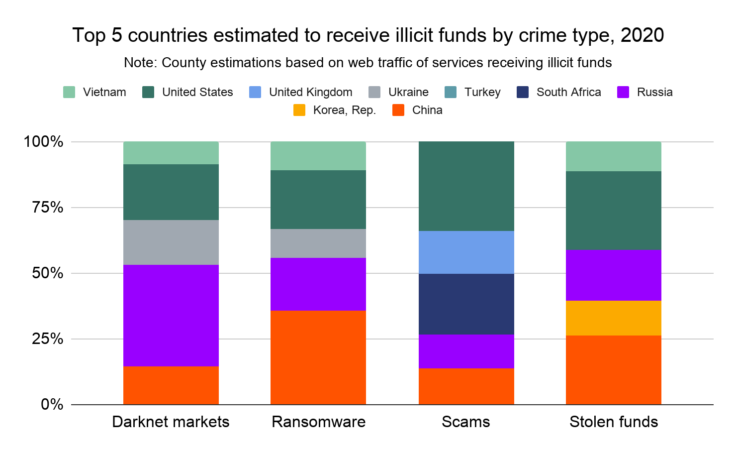 Sponsored SponsoredКитай также выделяется тем, что получает непропорционально большую долю средств, отправленных с адресов, связанных с украденными средствами и программами-вымогателями. Отчасти это может быть связано с кражей криптовалюты и деятельностью вымогателей, связанной с Lazarus Group, синдикатом киберпреступников, связанным с правительством Северной Кореи. Что же касается США, то большая часть преступлений связана с мошенничеством и вымогательством.