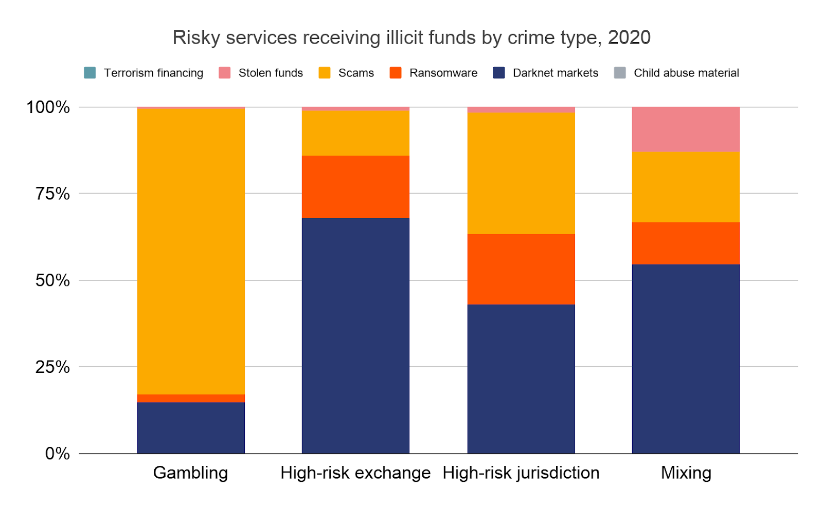 SponsoredВ 2020 году значительный объем трафика переместился с централизованных бирж на ресурсы, которые классифицируются как «рискованные», в том числе биржи с высоким уровнем риска, игровые платформы, миксеры и платформы, расположенные в юрисдикциях с высоким уровнем риска.