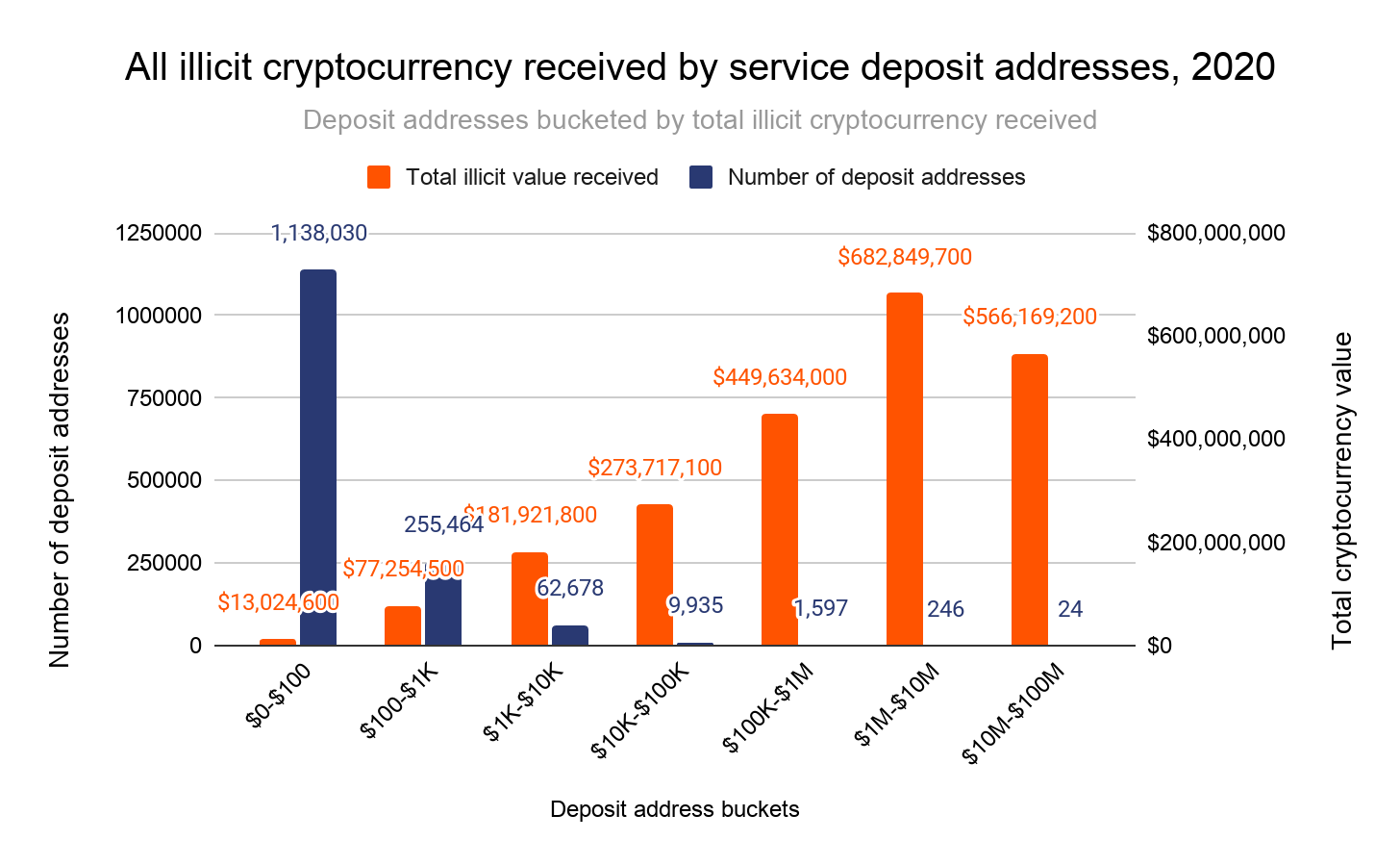 «Фактически, приведенные выше данные показывают, что группа всего из 1867 депозитных адресов получила 75% всей стоимости криптовалюты, отправленной с незаконных адресов в 2020 году. Меньшая группа из 270 депозитных адресов получила 55%. С точки зрения чистой стоимости, а не процентов, эти 270 адресов в совокупности получили незаконную криптовалюту на сумму 1,3 миллиарда долларов в 2020 году, а меньшая группа, состоящая всего из 24, получила незаконную криптовалюту на сумму более 500 миллионов долларов в 2020 году», — утверждают в компании.