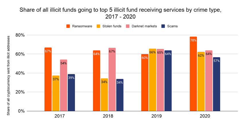 Как видно на диаграмме, большая часть незаконно полученных денег приходится на мошенничество и услуги даркнета.