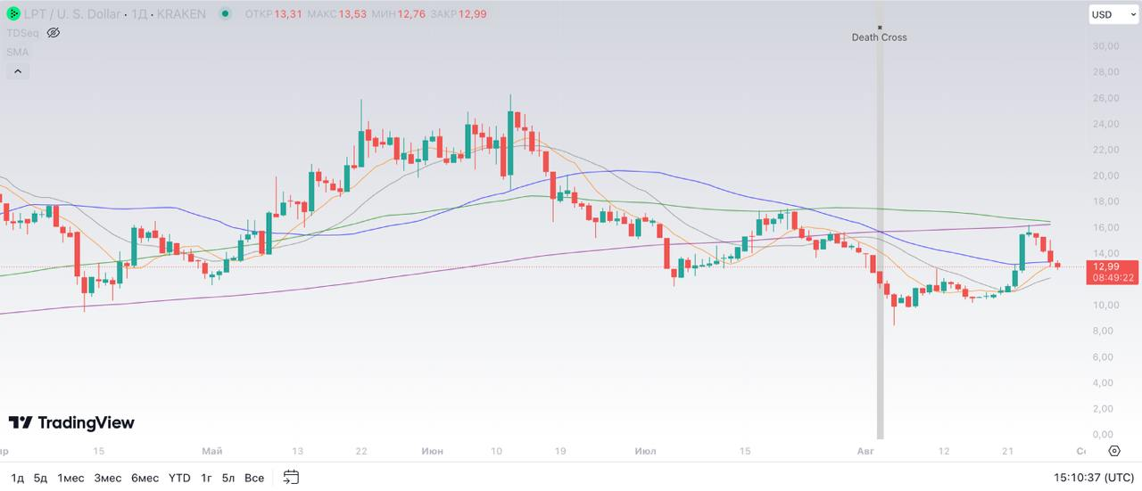 Сейчас цена опустилась ниже 50-дневной SMA (синяя линия на графике ниже). До закрытия торгов динамику криптовалюты еще можно считать за коррекционные движения. Однако в том случае, если LPT закроется ниже этой линии, бычий сценарий будет аннулирован