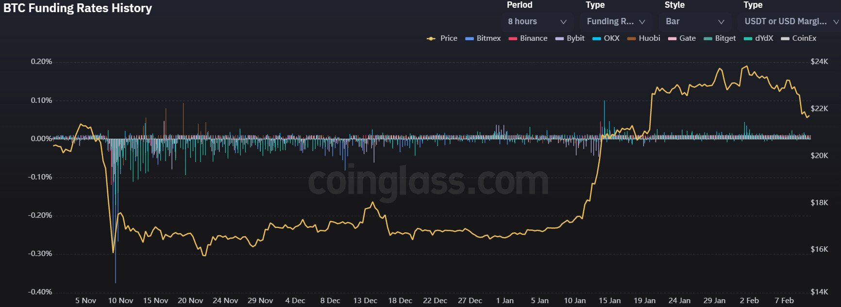 Тем не менее, быкам пока не стоит паниковать. Данные Coinglass показывают, что в ставках финансирования биткоин-левериджа не произошло существенных изменений и они все также остаются умеренно положительными. Это говорит о том, что на данный момент спекулянты настроены позитивно.