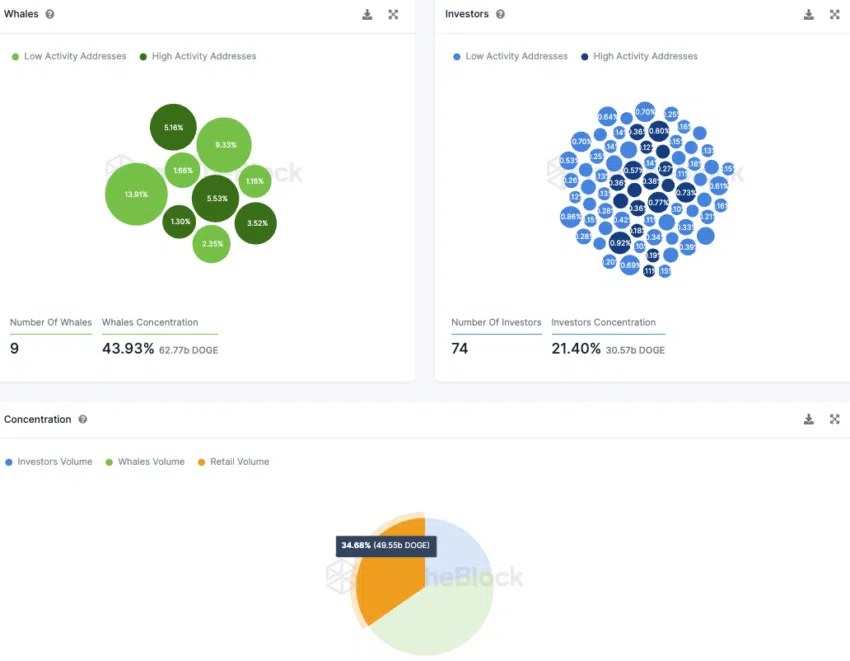 Распределение владельцев Dogecoin свидетельствует об обнадеживающих тенденциях. Розничные инвесторы держат более 30% токенов, в то время как группа из 74 адресов, владеющих от 0,1% до 1% от предложения DOGE, в совокупности владеет около 21,4% монет.