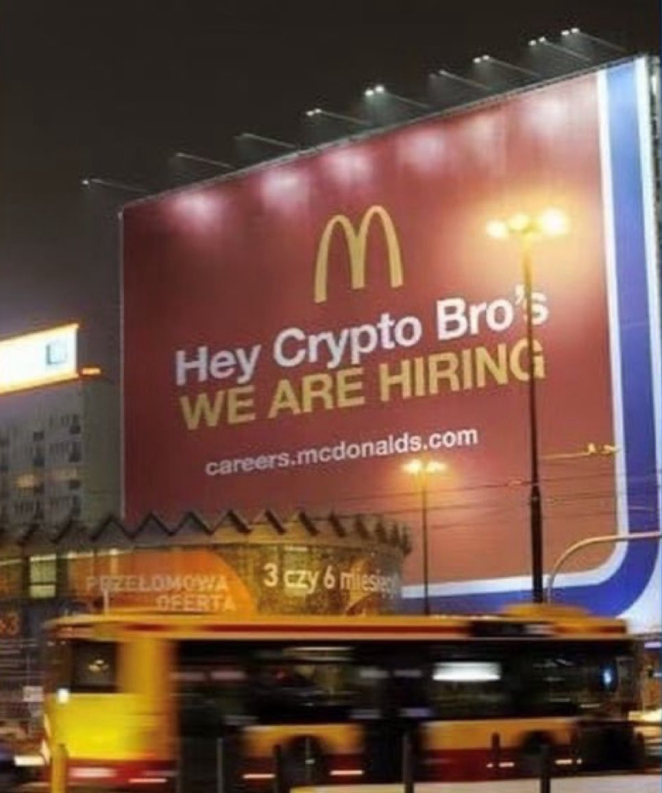 Пояснительная бригада: шутке про криптанов и McDonald’s много лет. Ее суть в том, что неудачливые инвесторы с большой долей вероятности будут вынуждены пойти работать в ресторан быстрого питания, чтобы получить хоть какие-то деньги.